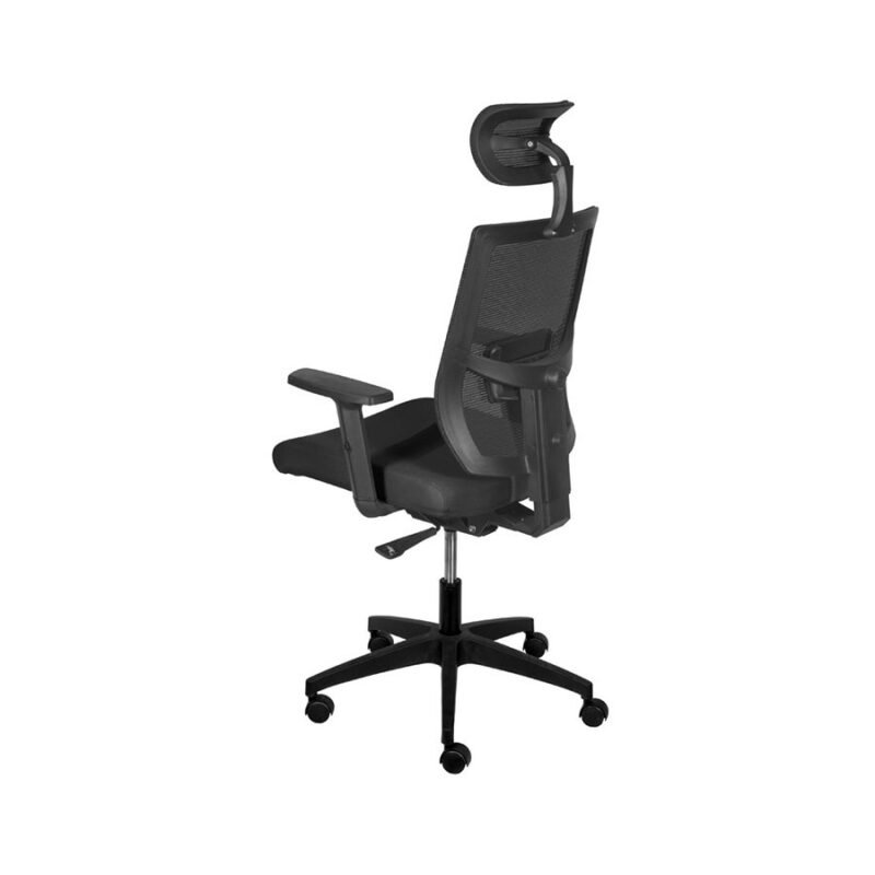 Assento e encosto em tela mesh, estrutura em nylon, rodas em pu que não risca o piso, ajuste de braço, ajuste de lombar, ajuste da altura do encosto, apoio de cabeça ajustavel, sistema relax com travamento e anti-impacto