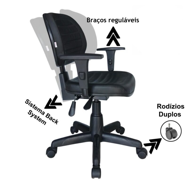 Cadeira Executiva Costurada Braço Digitador e Base Backsystem Giratória Preta – Courino Preto